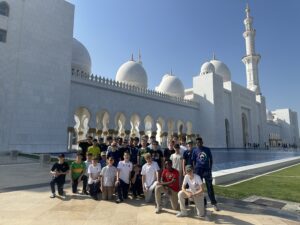 On Monday, we left Dubai early in the morning for an hour long journey to Abu Dhabi. The journey was exhausting but thanks to Mr Sinclair’s playlist and singing, we managed to survive. We went to the Abu Dhabi mall and bought delicious food and ice cream. After about an hour of walking around, we visited the mosque to gain some cultural experiences. It was interesting learning about the religion and the history of the mosque. There were beautiful chandeliers made out of expensive jewellery. After taking photos, we travelled to the incredible Zayed Sports City grounds and trained there for an hour which was a good warm up for our upcoming matches ahead and then it was time to meet our new host families.