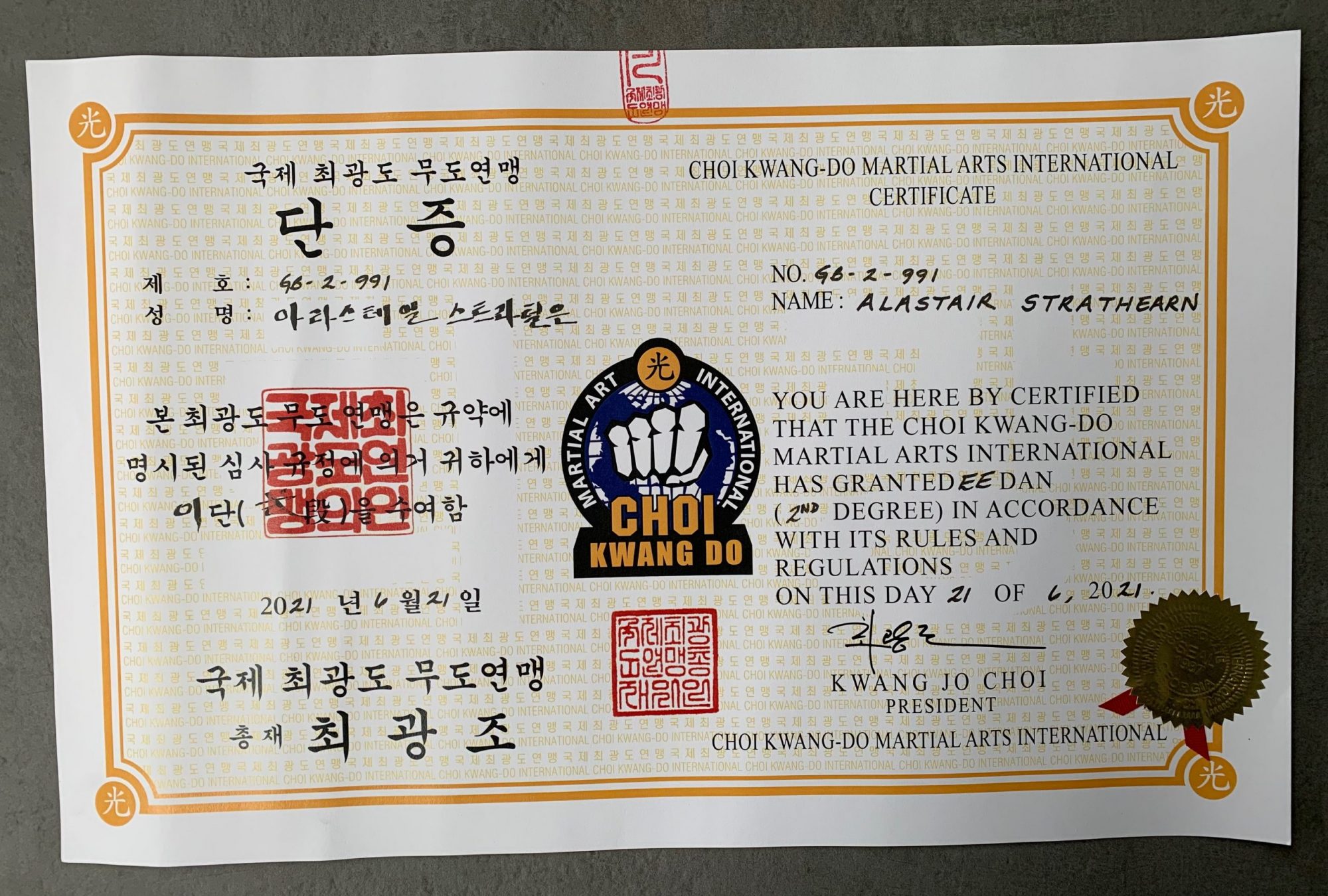 The certificate came all the way from the US, where it was signed by Grand Master Choi – the founder and head of the martial arts organisation.