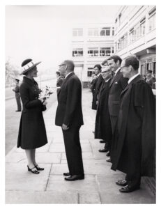 The Duchess of Kent greets staff including then Trinity Headmaster Oliver Berthoud (far right), who served the school from 1952-1972 and oversaw the move from North End to Shirley Park in 1965 (60 years this year) and the renaming of the school to the Trinity School of John Whitgift in 1954.